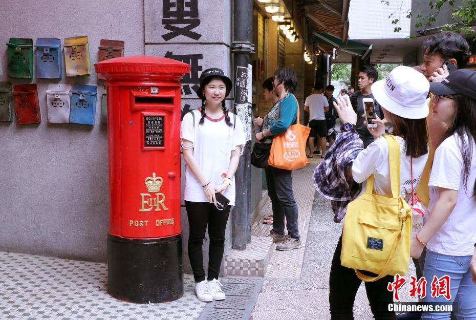 “香港街市”的怀旧色彩,将老香港文化一一呈现。图为4月29日,访客在“香港街市”大门摆设的旧邮筒前留影。据说,邮筒是从拍卖会上投回来的。中新社记者 洪少葵 摄
