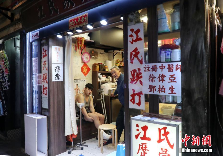“香港街市”内装饰成六十年代的九龙城寨,到各式各样的古老摊档,都富有怀旧色彩,将老香港文化一一呈现。图为4月29日再现旧时九龙城寨的趺打医馆。中新社记者 洪少葵 摄