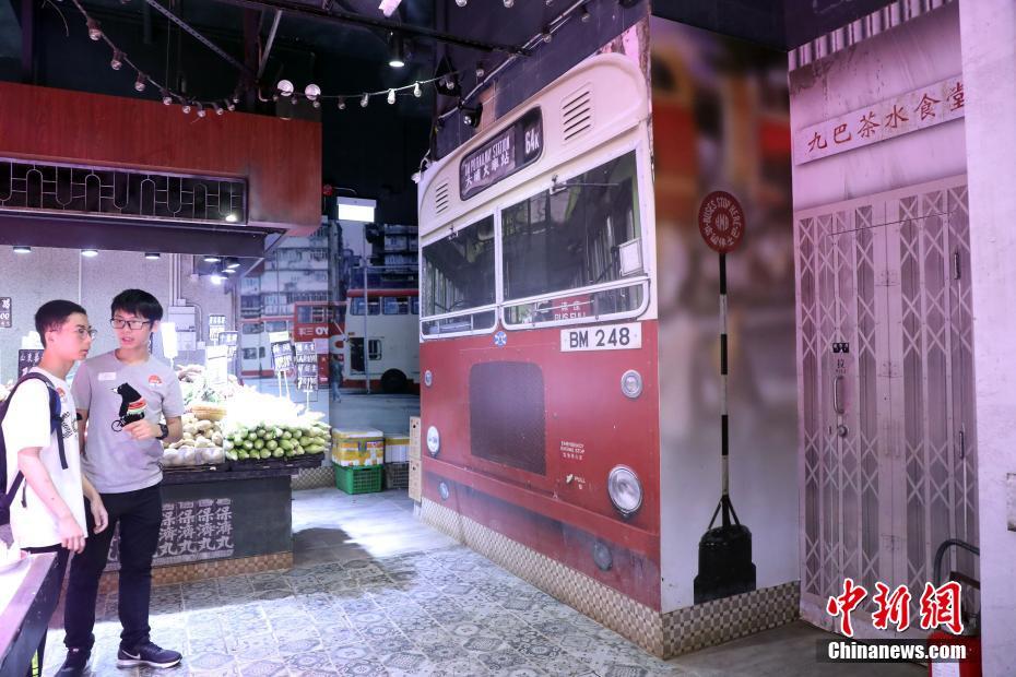 “香港街市”内装饰成六十年代的模样,再现九龙巴士站旧时场景。图为4月29日,游客在“香港街市”参观。中新社记者 洪少葵 摄