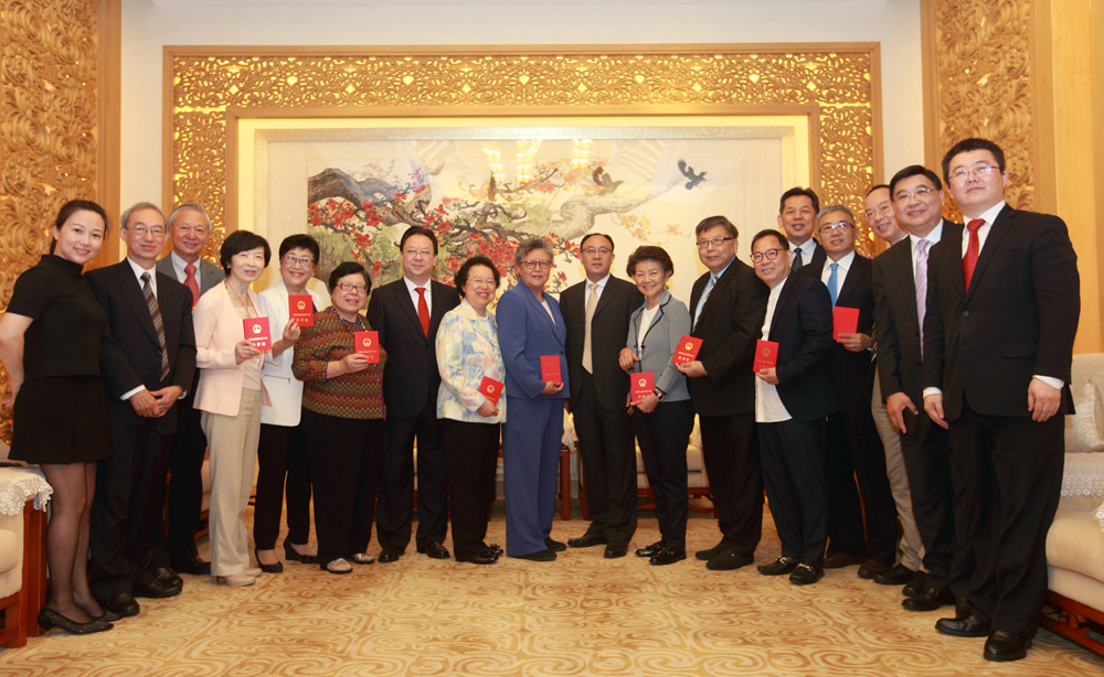 5月20日上午,我办副主任谭铁牛与全国人大常委会副秘书长郭振华向范徐丽泰等13位港区十二届全国人大代表颁发荣誉证书。(图片来源:中央政府驻港联络办)