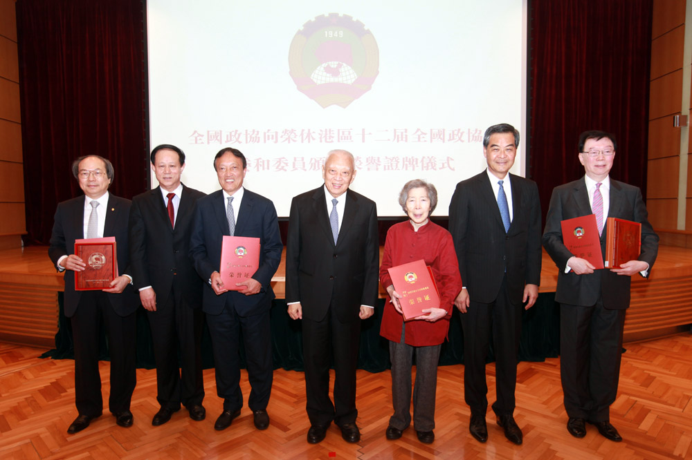 5月20日上午,全国政协副主席董建华、梁振英,副秘书长潘立刚向刘汉铨等近60位荣休港区十二届全国政协常委和委员颁发荣誉证牌。(图片来源:中央政府驻港联络办)