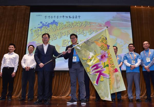 6月25日,香港青年内地参访团正式起行。陈冬副主任授团旗,团长霍启刚(前右)接受团旗。(图片来源:新华社 毛思倩 摄)
