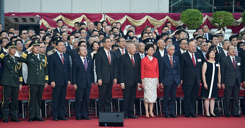 本网讯 7月1日上午,香港特区政府在金紫荆广场举行升旗仪式和酒会,庆祝香港回归祖国21周年。全国政协副主席董建华和梁振英,香港特区行政长官林郑月娥,我办主任王志民和副主任黄兰发、杨建平、杨健、仇鸿、陈冬、何靖,外交部驻港特派员公署特派员谢锋,解放军驻港部队司令员谭本宏、政委蔡永中以及中央驻港机构代表、特区政府官员、外国驻港领团代表、社会各界知名人士、制服团体代表和市民等约2400人出席观礼。