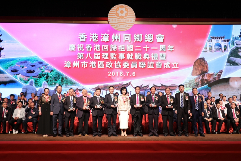 本网讯 7月6日晚,香港漳州同乡总会在香港会展中心举行庆祝香港回归祖国21周年、第8届理监事就职典礼暨漳州市港区政协委员联谊会成立庆典。我办副主任何靖应邀出席,并与福建省委统战部副部长陈飞,漳州市委常委、统战部部长黄水木,香港福建社团联会主席吴良好、荣誉主席林广兆、候任主席吴换炎,华闽(集团)有限公司总经理丁炳华等共同担任主礼嘉宾。香港社会各界人士和漳州乡亲近2000人参加了活动。