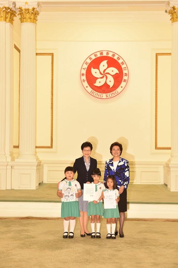 香港特区行政长官林郑月娥、我办副主任仇鸿向3名小朋友转交彭丽媛教授的回信。(图片来源:中新网)