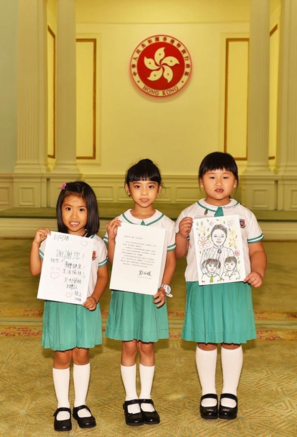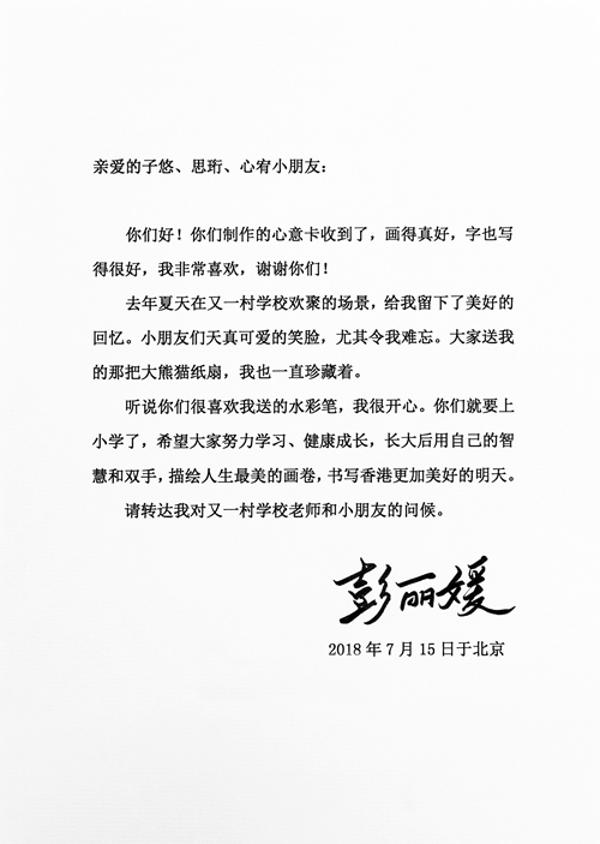 国家主席习近平夫人彭丽媛教授7月15日给3名刚从香港又一村学校毕业的小朋友回信,谢谢她们制作的心意卡,勉励她们努力学习、健康成长。23日,香港特区行政长官林郑月娥邀请3名学生到礼宾府聚会,亲自将回信交给她们。