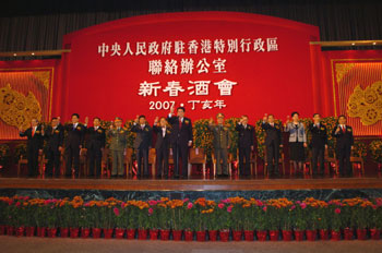 2月28日晚,中联办在香港会议展览中心新翼5楼隆重举行2007年新春酒会,共迎丁亥新春。中联办主任高祀仁,副主任王凤超、彭清华、郑坤生、李刚、郭莉、周俊明、黎桂康,以及香港特别行政区行政长官曾荫权,外交部驻港特派员吕新华,驻港部队司令员王继堂、政委张汝成,港区全国人大代表、政协委员,特区政府主要官员,外国驻港总领事和商会代表,驻港中资机构主要负责人以及香港各界人士约4000人出席。高祀仁主任致新春贺词,中联办负责人和主礼嘉宾共同祝酒,祝愿祖国和香港的未来更加美好。会场内灯火璀璨,鲜花如簇,气氛隆重而热烈。