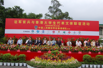 本网讯 2006年9月24日,解放军驻香港部队官兵与香港大学生代表文体联谊活动在粉岭新围军营举行,此次活动是驻港部队官兵第一次与大学生举行联谊活动。全港10所专上院校的200名大学生代表参与本次活动。中联办副主任李刚、驻港部队司令员王继堂中将、特区政府民政事务局局长何志平、外交部驻港特派员公署副特派员明俊富、驻港部队副司令员董文久少将、中央政府驻港联络办副秘书长兼青年部部长王志民、教统局首席助理秘书长陈嘉琪以及香港10所专上院校的校长或副校长出席了本次活动。