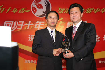 李刚为香港各界青少年庆回归十周年组委会执行主席曾智雄颁发纪念品