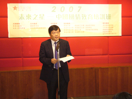 本网讯 2007年8月20日上午,由香港文汇报社、“未来之星”同学会主办的“2007未来之星——中国国情教育培训班”在港启动。中联办青年工作部副部长张春生、香港文汇报副社长韩力、香港青年事务委员会委员卢平、特区政府民政事务局行政主任李宝文等嘉宾出席活动出发礼。