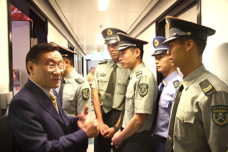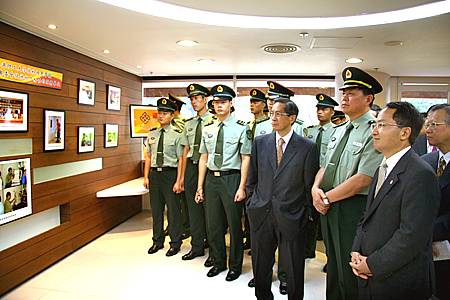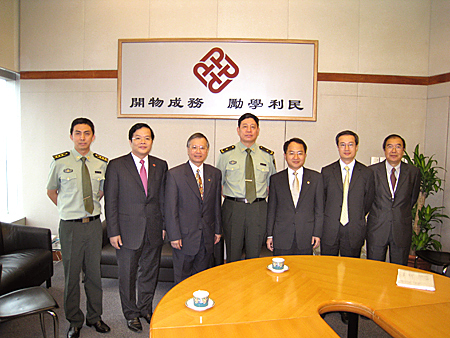 理工大学校长潘宗光(右三)陪同驻港部队副司令王玉仁少将(右二)、中联办副秘书长王志民(右一)及驻港官兵代表参观校园