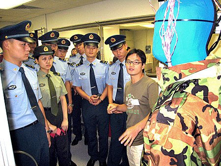 理工大学研究生向驻港部队官兵介绍全球首个可模拟人体流汗的暖体假人的科技原理