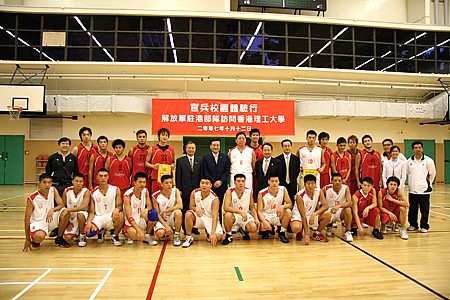 理大校长潘宗光、驻港部队副司令王玉仁少将、中联办副秘书长王志民与驻港部队篮球队(白衫)和理工大学篮球队(红衫)合影