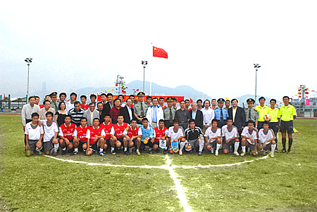活动嘉宾与驻港部队足球队和香港高校足球队合影