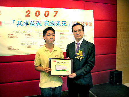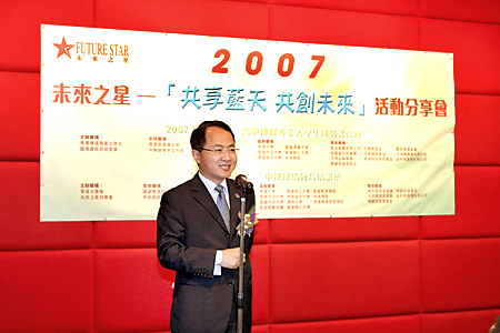 本网讯 2007年11月17日上午,由香港文汇报社、“未来之星”同学会主办的2007未来之星—“共享蓝天·共创未来”活动分享会在香港文汇报隆重举行。中联办副秘书长兼青年工作部部长王志民、港区全国人大代表谭惠珠、中联办青年部副部长李蓟贻、香港文汇报副社长韩力、珠海学院校长张忠柟、特区政府民政事务局青年事务委员会委员陈勇等嘉宾出席并主礼。