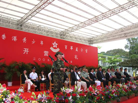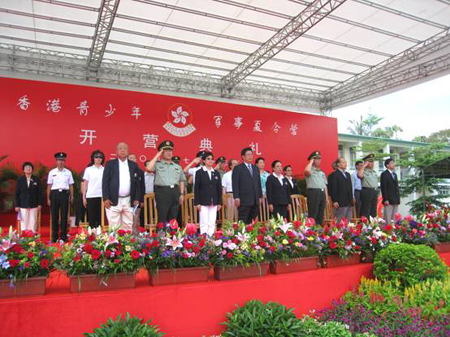 本网讯 7月13日上午,由群力资源中心、中国人民解放军驻香港部队和特区政府教育局联合主办的第五届“香港青少年军事夏令营”在驻港部队新围军营举行开营典礼。驻港部队司令员张仕波、中联办副主任周俊明、外交部驻港特派员公署副特派员詹永新、香港青少年军事夏令营发起人兼名誉主席董赵洪娉、特首夫人曾鲍笑薇和中联办青年部负责人等出席主礼。来自全港120间中学的200名学生将在驻港部队进行为期15天的军事夏令营活动。