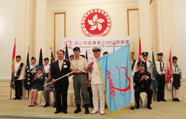 本网讯 7月13日,由香港13个青少年制服团体主办的“同心同根万里行2012”授旗礼活动在礼宾府举行,这是该活动自举办以来,第二次在礼宾府举行授旗礼。行政长官梁振英、中联办副主任王志民、香港公民教育委员会主席李宗德、香港青年事务委员会主席陈振彬等出席活动并担任主礼嘉宾。