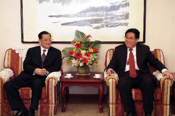 2005年12月8日,中央人民政府驻香港特别行政区联络办公室主任高祀仁(右)会见并宴请来港出席香港中文大学授予荣誉博士学位典礼的中国国民党荣誉主席连战