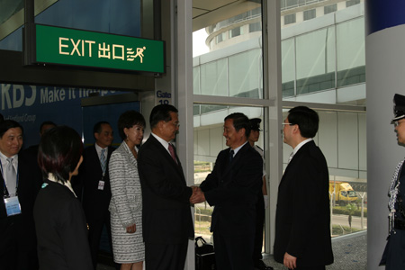 中央政府驻港联络办台湾事务部部长邢魁山,香港特区政府政制事务局局长林瑞麟、行政长官副官邱国裔,中共中央台湾工作办公室副局长何建华,香港特区政府政制事务局常任秘书长谢凌洁贞到机场迎送。