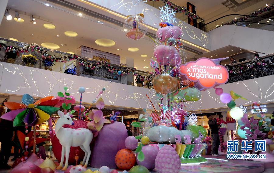 12月24日,在香港铜锣湾世贸中心,一对父女在澳大利亚艺术家创作的彩糖主题圣诞装饰处拍照。近日,香港各大商场纷纷推出不同主题的圣诞装饰,让顾客在享受购物乐趣的同时,感受浓浓的圣诞气氛。 新华社记者赵宇思摄