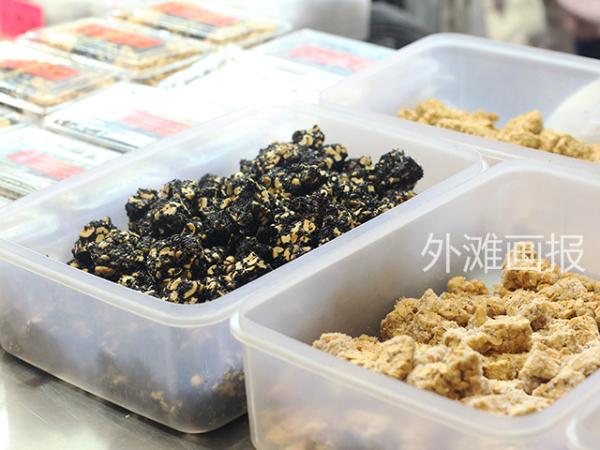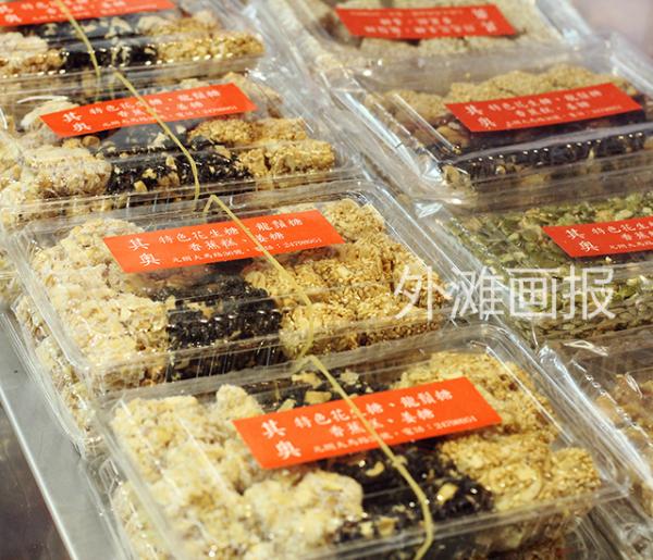 摊子右边摆着切片花生糖任食客尝试