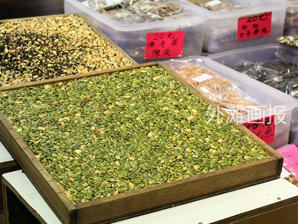 摊位右边的几个透明盒放着几种不同口味的切片花生糖,过客都停下来尝几块,吃过都赞不绝口。我也忍不住买了一盒黄生糖三宝和一盒南瓜子花生糖准备带回上海。
