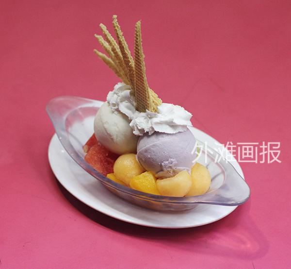 鲜杂果新地有多种冰淇凌可供选择,以防失嘴挑了不和口味的搭配,就依着菜单推荐选了香草和芋头味。拿起威化饼沾奶油和冰淇淋,伴着松脆且丝丝入滑。