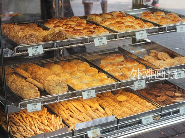 千式面包屋的装修还是几十年前老式面包店的样子,简单玻璃柜里摆着层出不穷的糕点,别看店铺外观简朴,面包的色泽卖相算得上同等价位中的一等一。