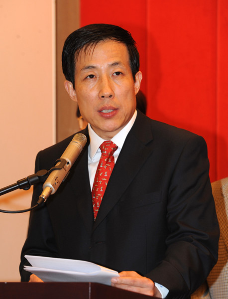 图为中央政府驻港联络办副主任杨建平在酒会上致辞。