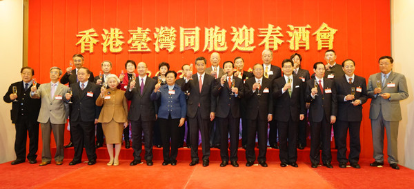 本网讯 中央政府驻港联络办15日在香港中区大会堂举行“2013年香港台湾同胞迎春酒会”。中联办副主任杨建平,香港特区行政长官梁振英,港台经济文化合作协进会主席李业广,居港台胞、香港各界知名人士、内地特邀嘉宾等700余人出席酒会,共贺新春。