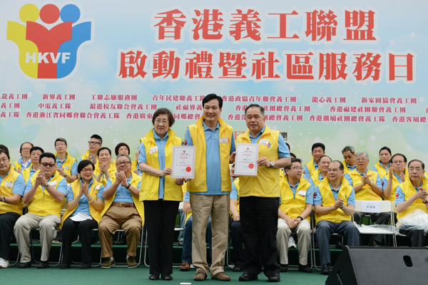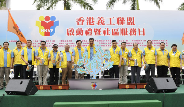 本网讯 6月15日上午,“香港义工联盟”启动礼暨社区服务日活动在香港文化中心广场举行。香港特区行政长官梁振英、中央政府驻港联络办副主任林武、中华海外联谊会秘书长郑钢淼,在全国政协文史和学习委员会副主任、义工联盟主席谭锦球陪同下主礼。港岛、九龙、新界、广东社团总会、福建社团联会、广西社团总会、社福界、中企协、中电、亚视、新家园协会、家庭团聚互助会等24个义工团体逾2000名代表出席。