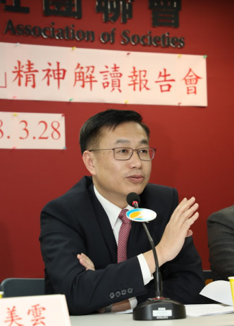 本网讯 3月28日下午,我办副主任何靖应邀出席新界社团联会举办的2018全国两会精神解读报告会,携手港区全国人大代表陈勇、邝美云、张俊勇,与到会的新界社团联会理事、新界区议员、社区干事、义工领袖等130余人分享了对今年两会的心得体会。