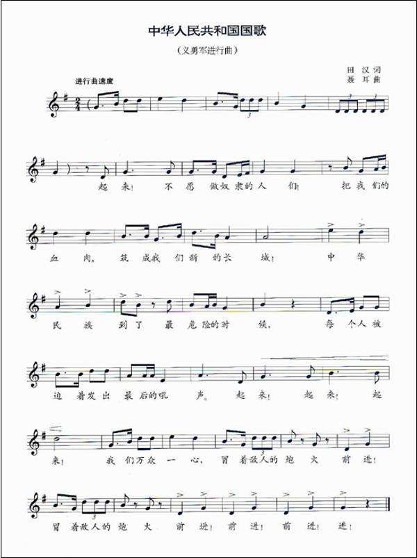 田汉作词、聂耳作曲的《义勇军进行曲》,被称为中国民族解放的号角,自1935年在民族危亡的关头诞生以来,在人民中广为流传,对激励中国人民的爱国主义精神起了巨大的作用。1949年中国人民政治协商会议决定把这首歌作为代国歌,体现了中国人民的革命传统和居安思危的思想。