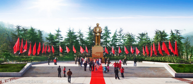 毛泽东铜像广场位于韶山毛泽东纪念馆大门前80 米处,是经中共中央批准兴建的纪念毛泽东一百周年诞辰重点献礼工程。 毛泽东铜像重3.7 吨,像高 6 米,基座高4.1 米,通高10.1 米,象征着“10.1”国庆,更象征着毛泽东是新中国的缔造者。像面朝东南方,身着中山装,左胸前挂着“主席”证,手执文稿,目光炯炯,面带微笑,正视前方,巍然挺立,成功地再现了人民领袖毛泽东出席开国大典时的风采。