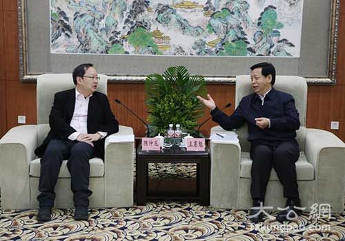 黑龙江省委书记王宪魁(右)向交流团团长陈仲尼介绍当地风光 。记者何嘉骏摄