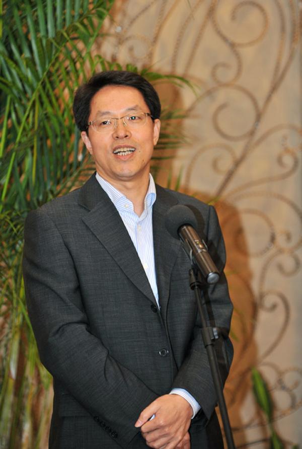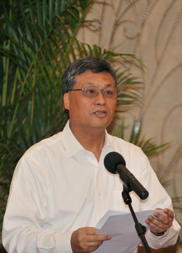 比亚迪总裁王传福向考察团介绍企业发展情况