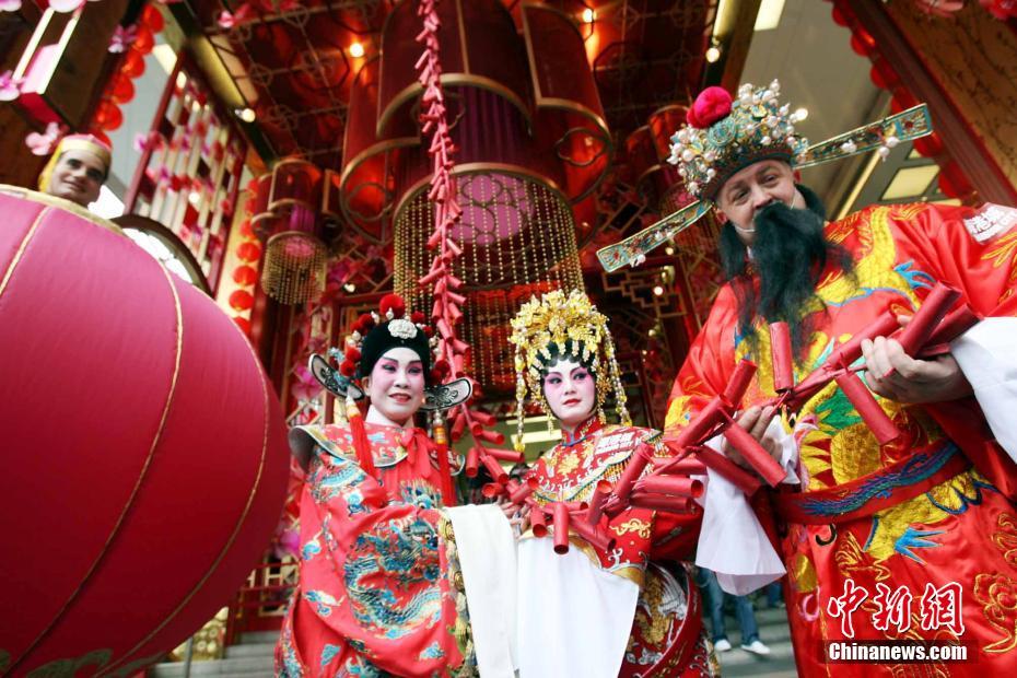 回归20年,香港的中国传统文化习俗持续发扬光大,农历新年春节市民照例要派“利是”(红包),迎财神,有的还出动中西财神迎春纳福。图为香港一家大型商场的新春开市礼。中新社记者 洪少葵 摄
