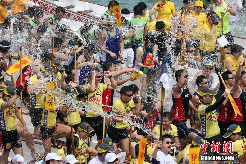 香港回归20年,现代都市中的中国传统文化习俗持续发扬光大。吃粽子、扒龙舟是港人每年过端午节的传统活动。近年来,香港还举办一年一度的“香港国际龙舟邀请赛”,图为龙舟邀请赛场景。中新社记者 洪少葵 摄