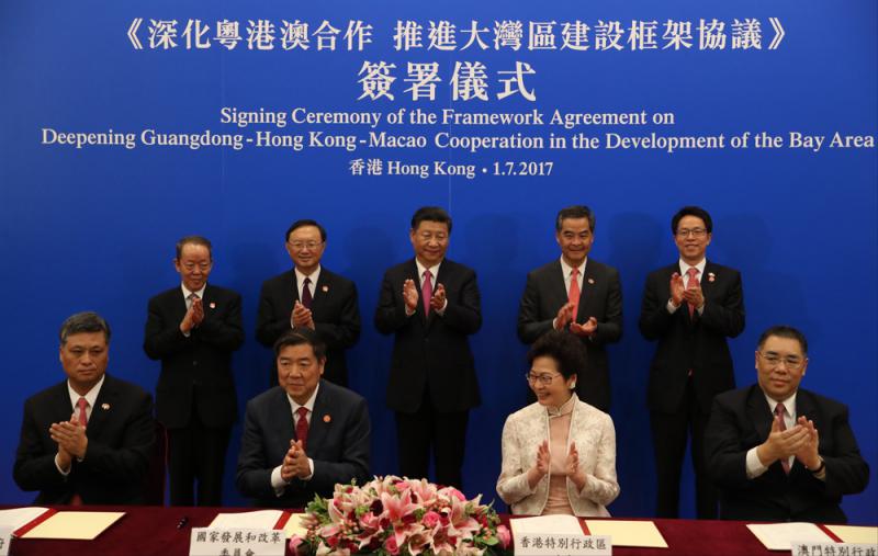 国家主席习近平于二○一七年七月一日,在香港见证《深化粤港澳合作推进大湾区建设框架协议》签署仪式。(图片来源:大公报)