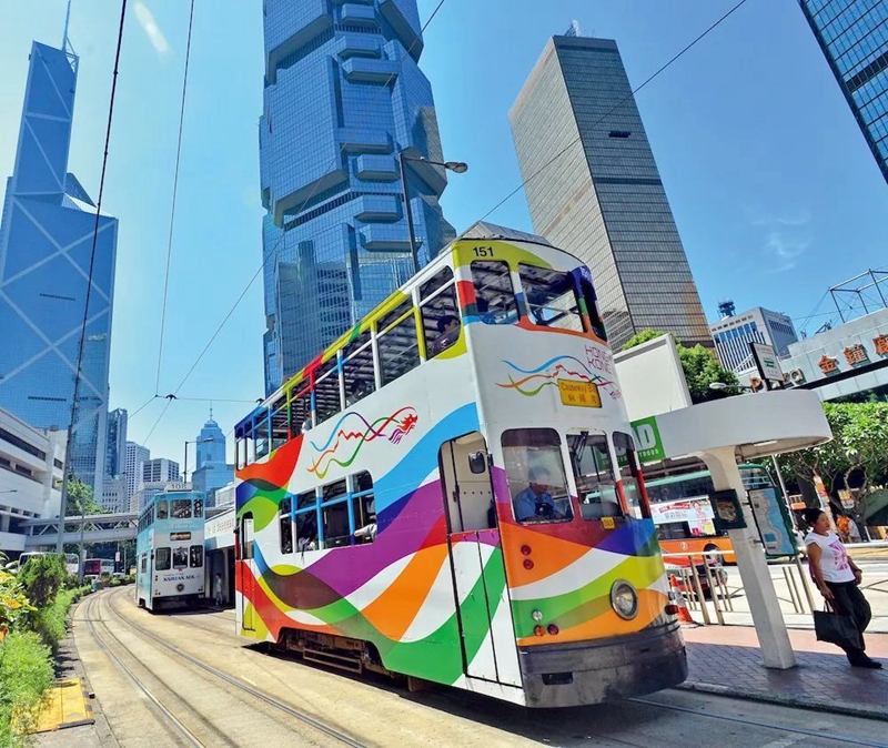 去年七一以来,香港社会呈现好的发展态势,市面祥和。图为拥有百年历史的叮叮车驶过中环金融中心。(图片来源:香港特区政府新闻处)