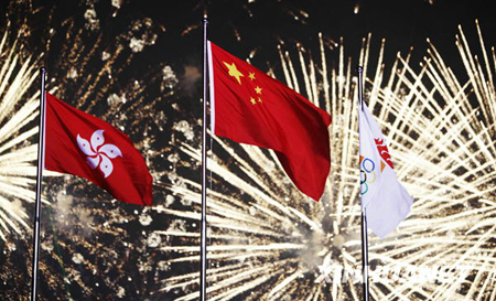 中国国旗、中国香港特别行政区区旗和东亚运动会会旗在烟火映衬下飘扬(新华社记者 费茂华摄)