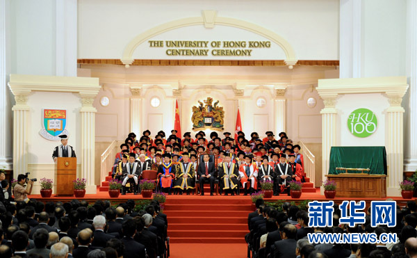 8月18日,香港大学举行百周年校庆典礼,国务院副总理李克强出席典礼并致辞。这是李克强(中)在典礼上。新华社记者 马占成 摄